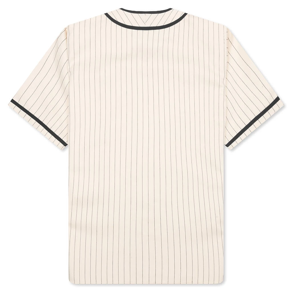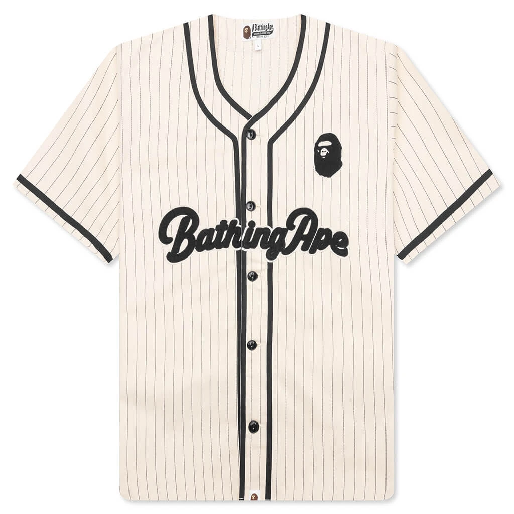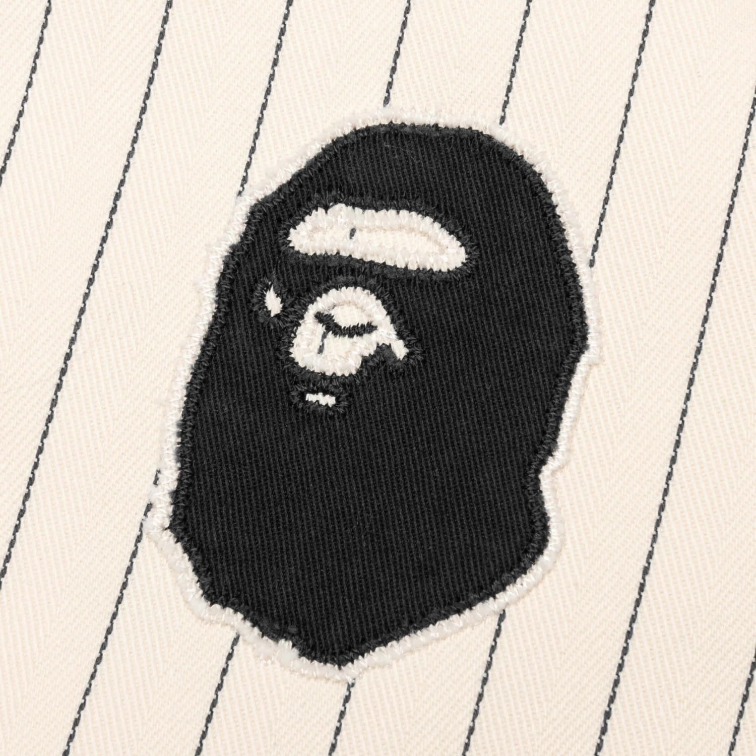 The A Bathing Ape Baseball Shirt in Ivory blends classic sportswear style with BAPE’s iconic detailing. Made from polyester, this button-up shirt features embroidered branding and a patch BAPE head motif for a standout look. The all-over pinstripe design adds a timeless touch, making it a perfect mix of athletic and streetwear style.