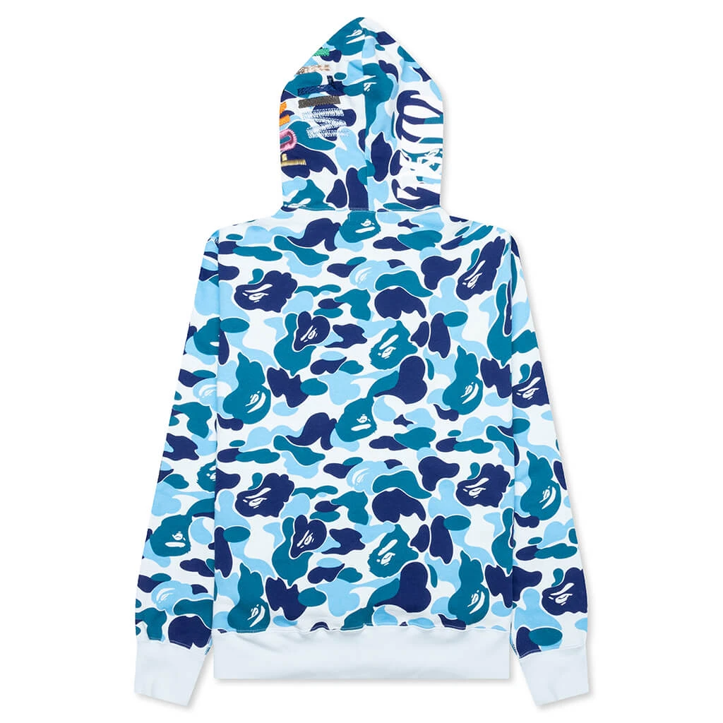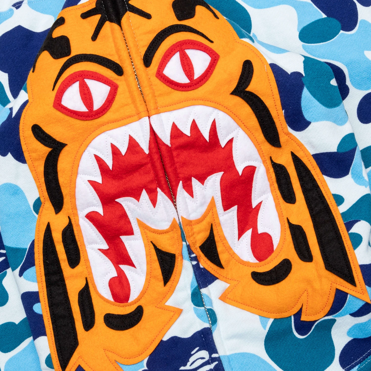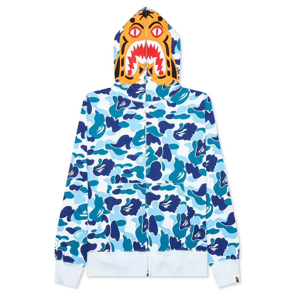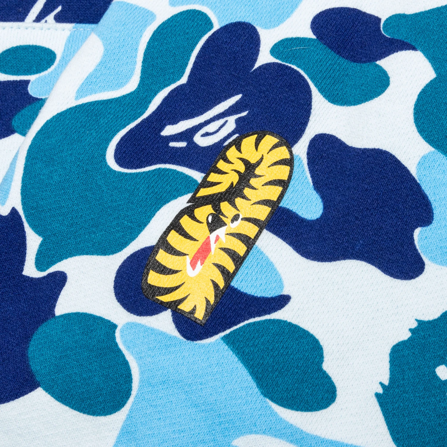 The ABC Camo Tiger Full Zip Hoodie in Blue combines bold design elements with everyday comfort. Crafted from cotton, this full-zip hoodie features embroidered patchwork and printed graphics for a unique look. The signature Bape Camo print adds a touch of iconic style, while the kangaroo pocket and ribbed trims ensure both functionality and a snug fit.