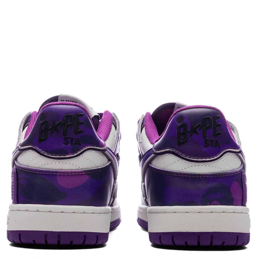 The Bape SK8 STA #1 M2 in Purple blends timeless design with signature Bape details. Crafted with a premium leather upper, the sneaker features embroidered branding for a subtle yet elevated touch. A perforated toe box adds breathability, while the durable rubber outsole ensures reliable traction. Finished with a woven branded label on the tongue, this sneaker delivers classic style with unmistakable Bape flair.