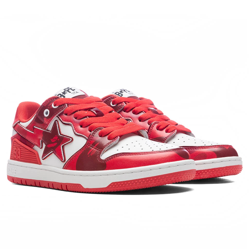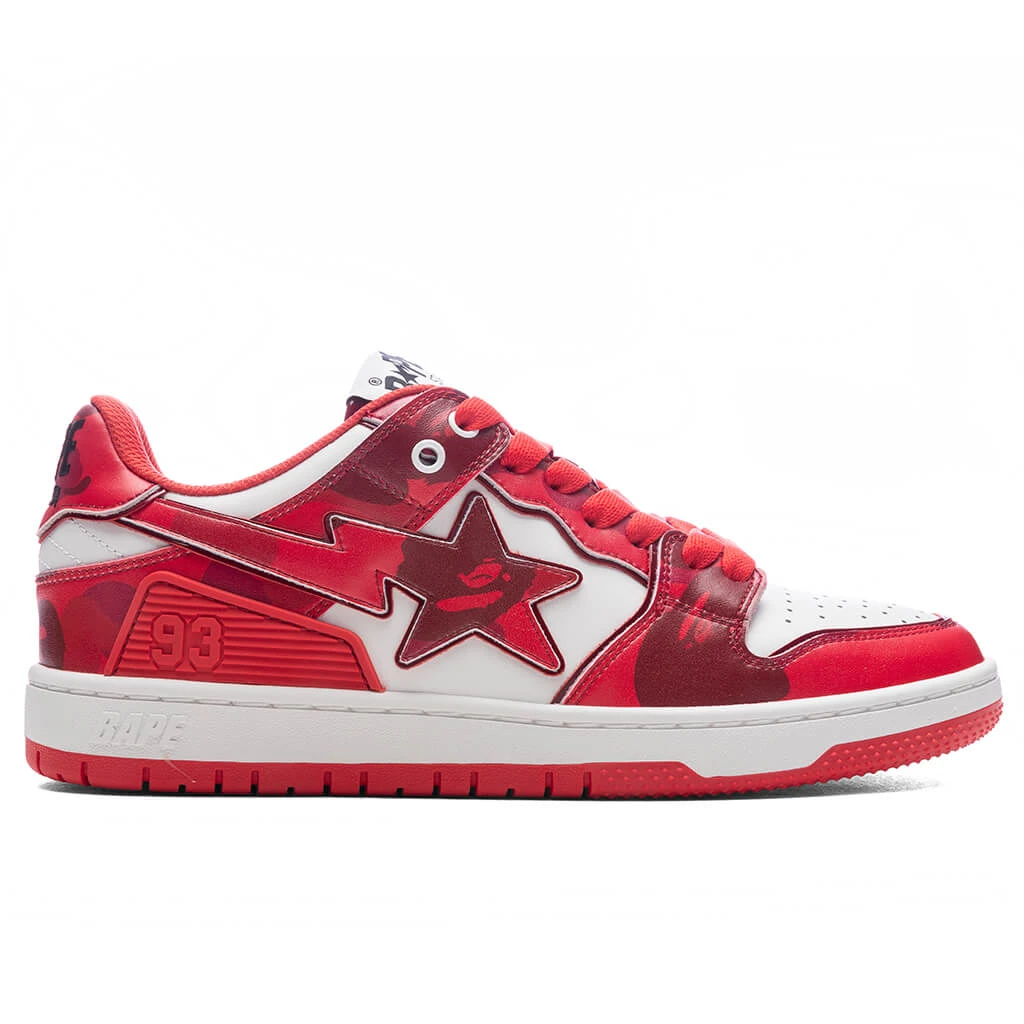 The Bape SK8 STA #1 M2 in Red blends timeless design with signature Bape details. Crafted with a premium leather upper, the sneaker features embroidered branding for a subtle yet elevated touch. A perforated toe box adds breathability, while the durable rubber outsole ensures reliable traction. Finished with a woven branded label on the tongue, this sneaker delivers classic style with unmistakable Bape flair.