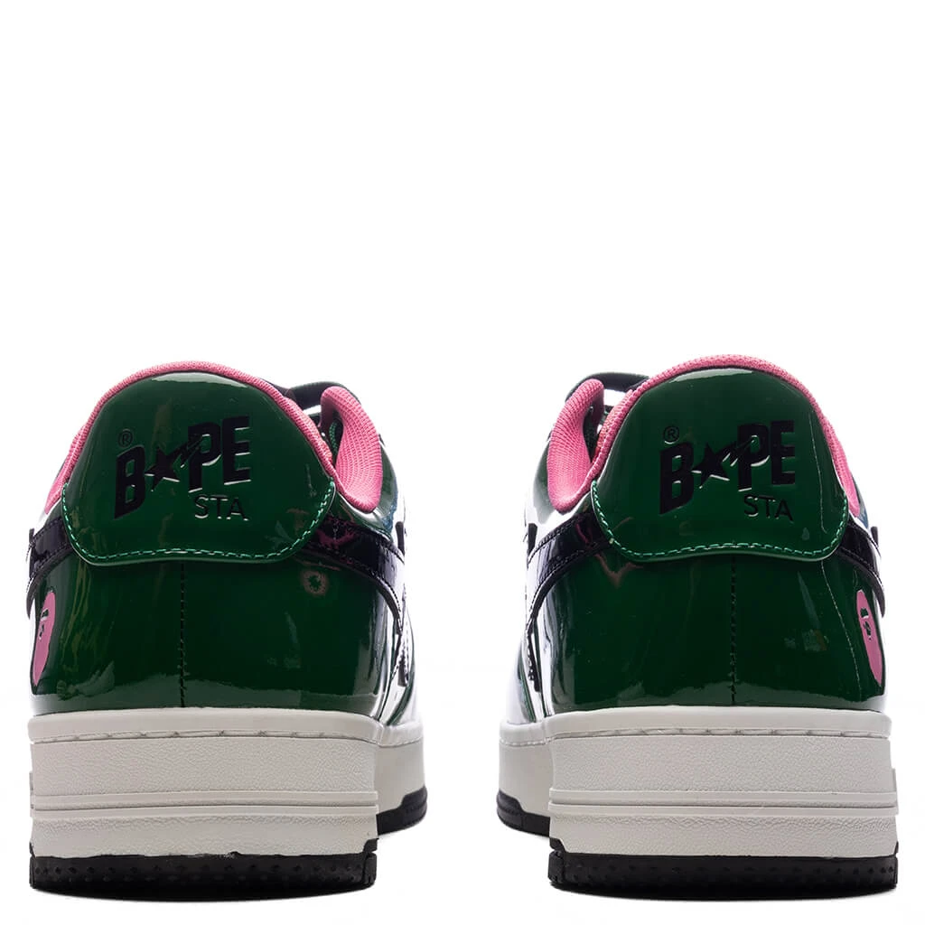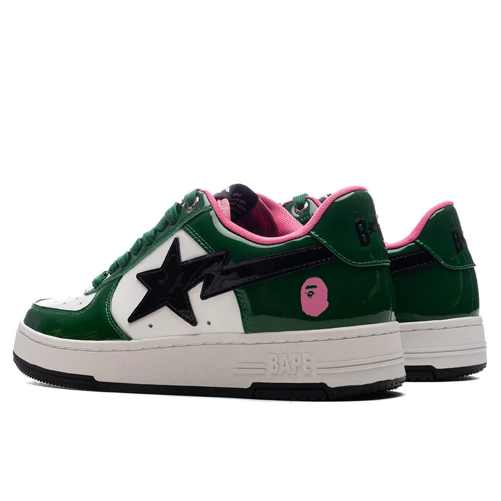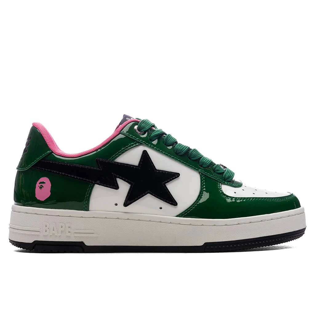 The Bape STA #1 M2 in Green brings a fresh take to a timeless silhouette. Featuring a leather upper with patent leather overlays, the design blends texture and shine seamlessly. The iconic STA logo adorns the side panels, while a perforated toe box ensures added breathability. A branded dubraé and embroidered heel complete the look, delivering signature Bape style in every detail.