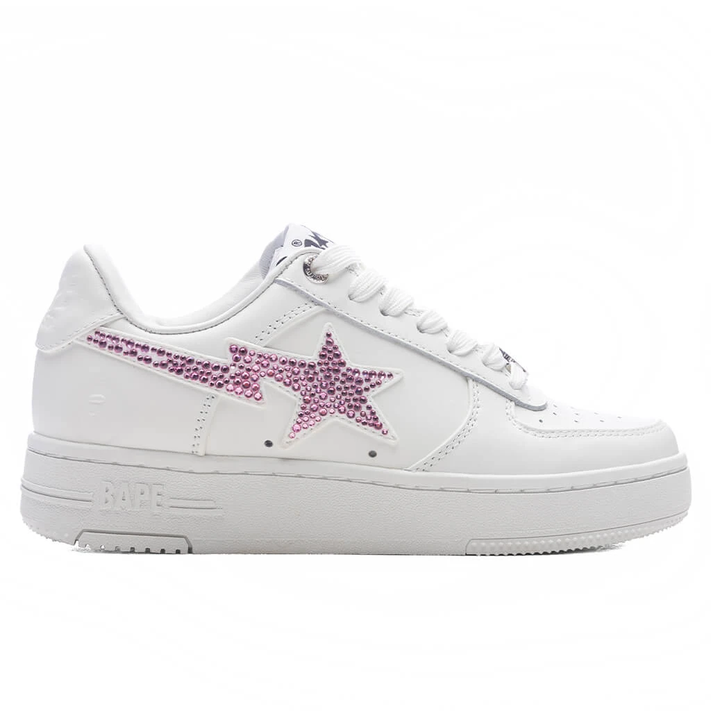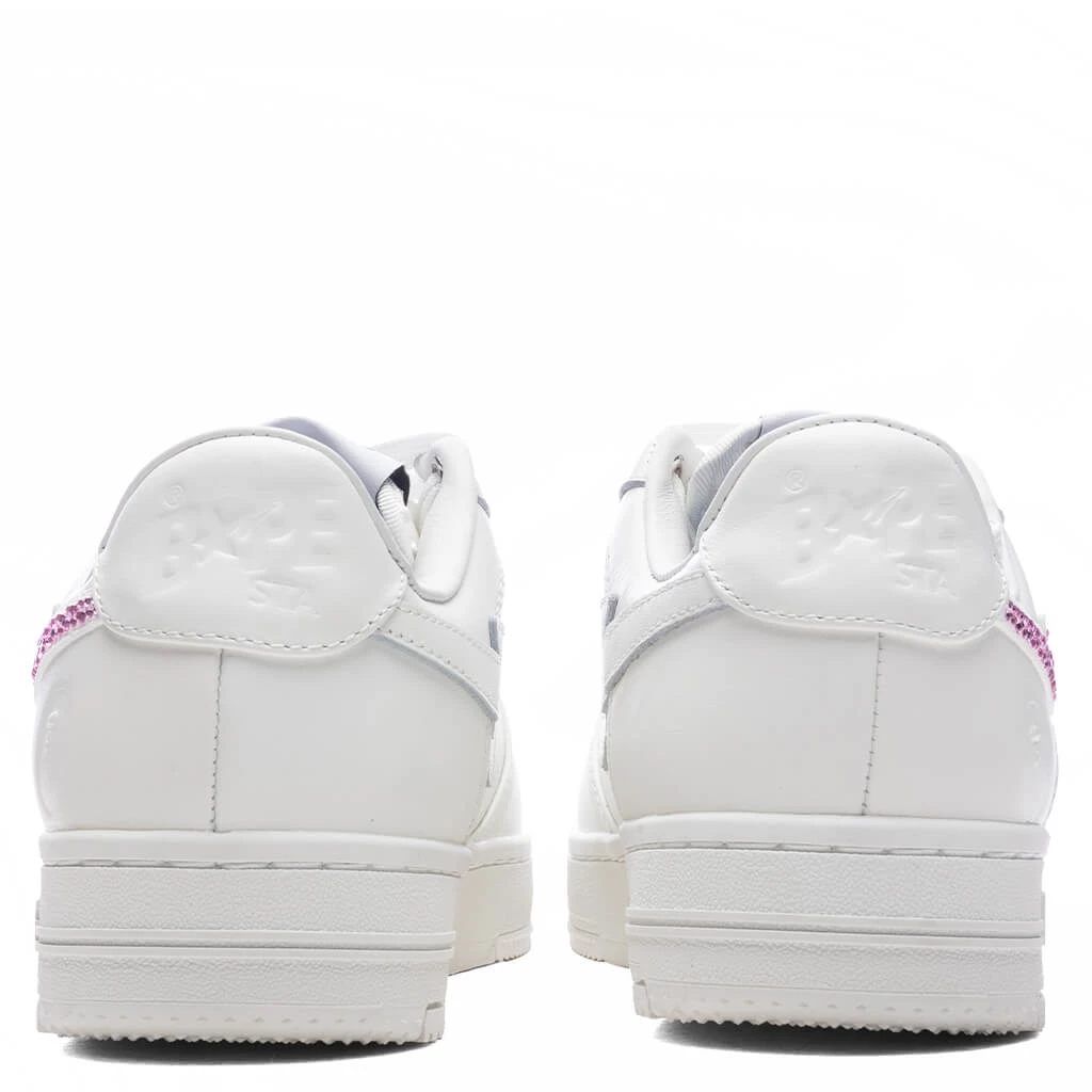 The Bape STA #50 in White brings a touch of elegance to a classic design. Featuring a premium leather upper, this silhouette stands out with a crystal-embellished STA logo on the side panel. A perforated toe box adds breathability, while the durable rubber midsole and outsole ensure long-lasting comfort. Finished with a branded dubraé and embroidered heel branding, this sneaker perfectly blends sophistication and streetwear style.