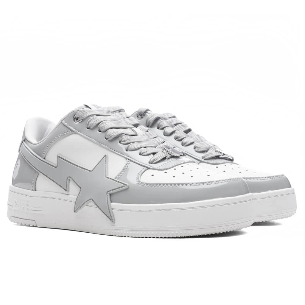 The Bape STA OS #3 M2 in Gray reimagines the classic silhouette with refined details. A leather upper pairs with patent leather overlays, adding a sleek, layered look. The exaggerated STA logo stands out against the design, while the perforated toe box enhances breathability. Finishing touches include a branded dubraé and embroidered heel for signature branding elements that elevate this timeless style.