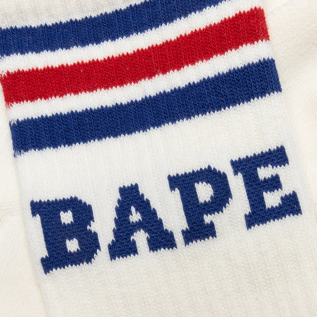 The Bape Stripe Socks in Blue/Red offer both comfort and style. These tube socks are crafted from a blend of cotton, polyester, nylon, and polyurethane for a snug yet breathable fit. Featuring bold woven stripe designs, they add a distinctive touch to any outfit.