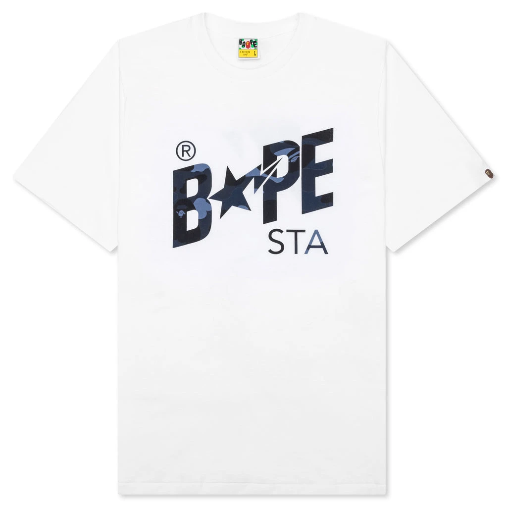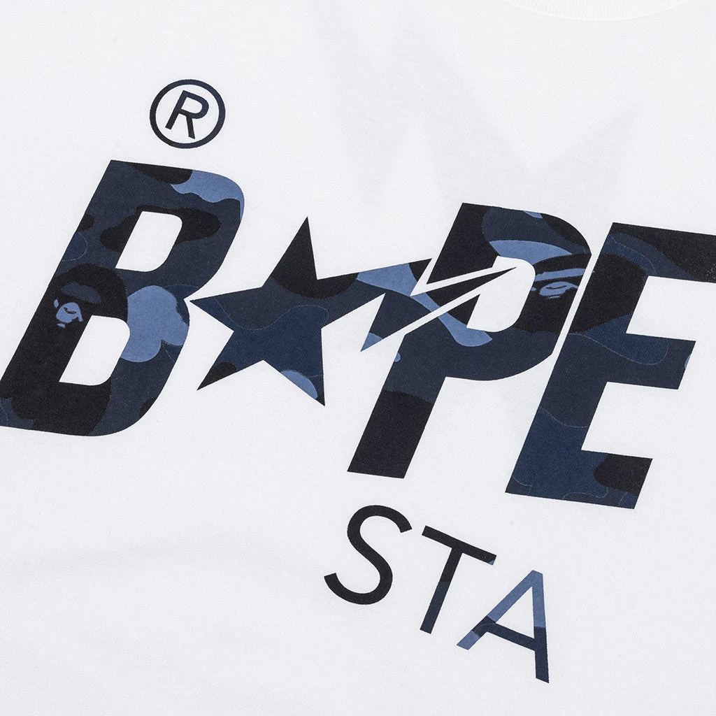 The Color Camo Bape STA Tee in White is crafted from pure cotton, offering a comfortable fit. This tee features bold printed graphics and a ribbed collar for a classic look. A sewn-on label tab adds a touch of signature branding.