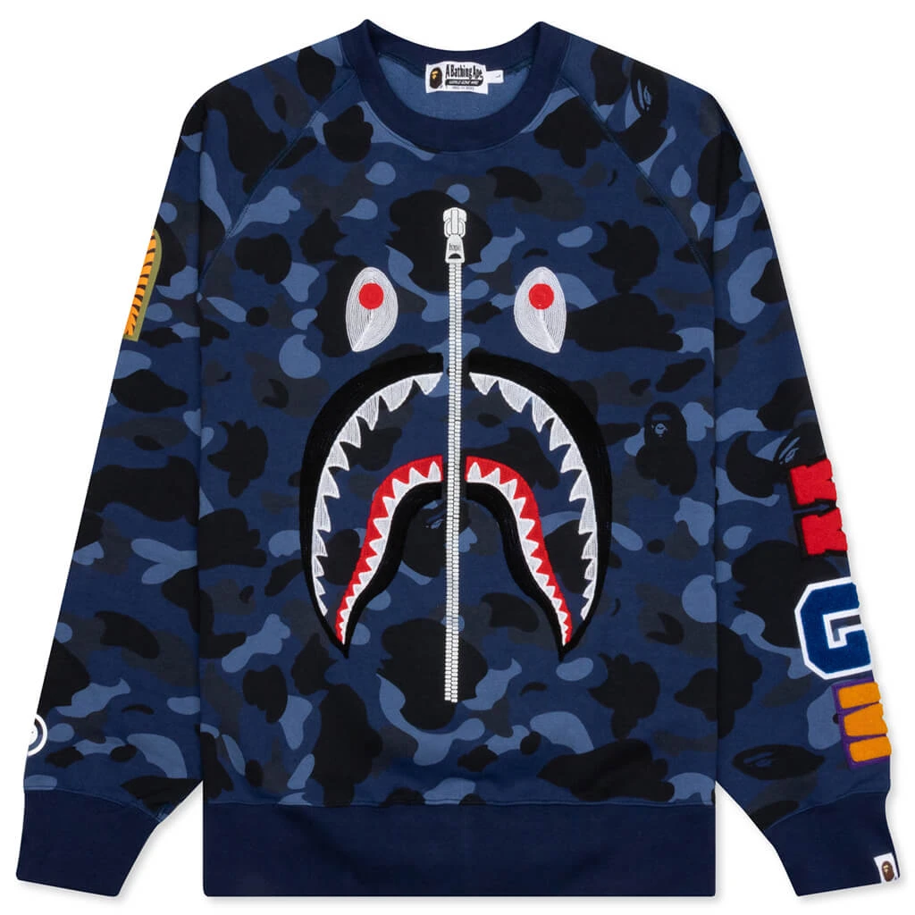 The A Bathing Ape Color Camo Embroidery Shark Crewneck makes an impression with its aesthetic. The silhouette features a cotton blend in addition to ribbed detailing at the trims. An array of screen-printed and embroidered branding and graphics are seen throughout. The camo print finishes the look.