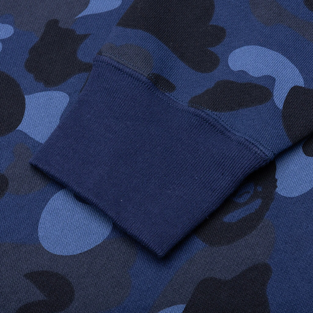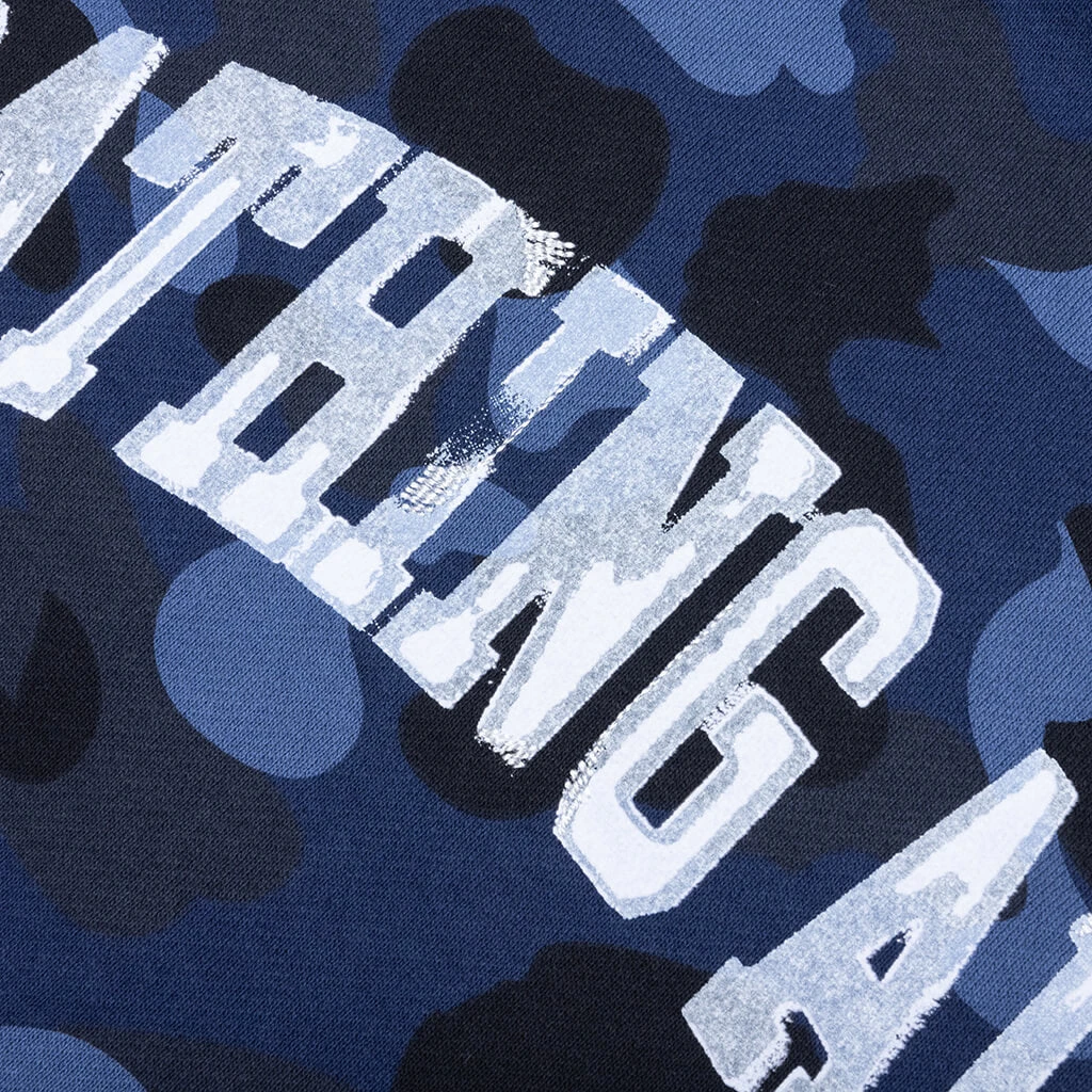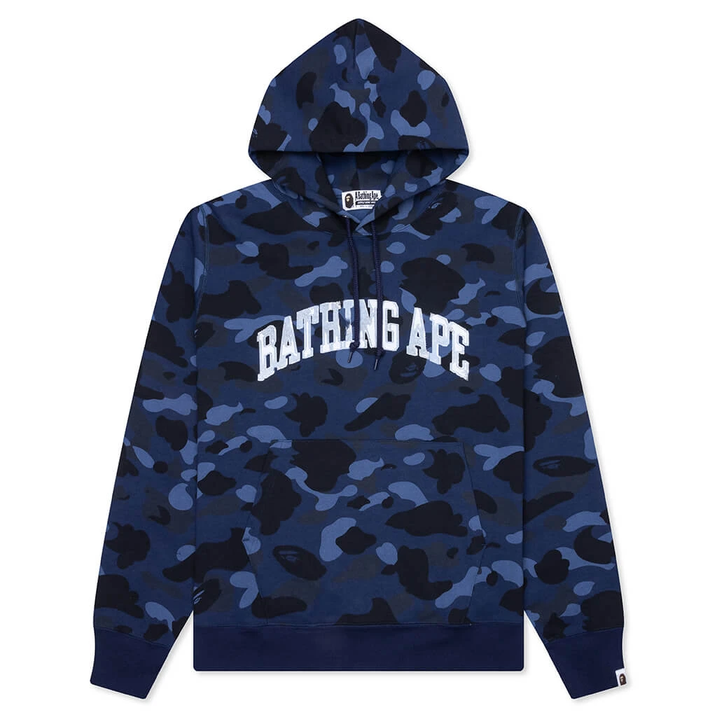 The Color Camo Pullover Hoodie in Navy showcases a bold all-over BAPE camo design, delivering signature style. Made from cotton, this hoodie features a screen-printed script on the front for added flair. A kangaroo pocket and an attached hood with adjustable drawstrings provide practical functionality, while ribbed cuffs and hem ensure a snug fit.