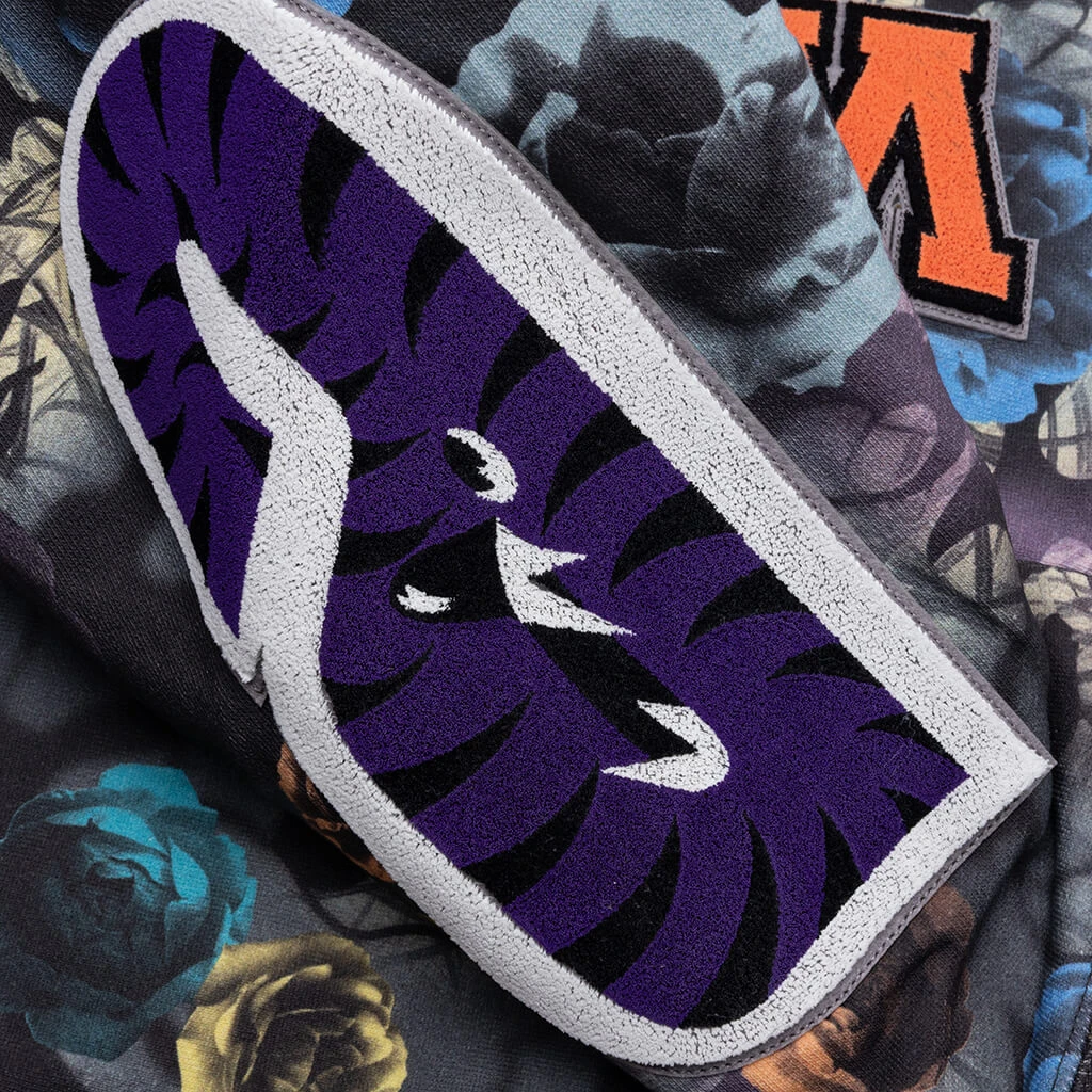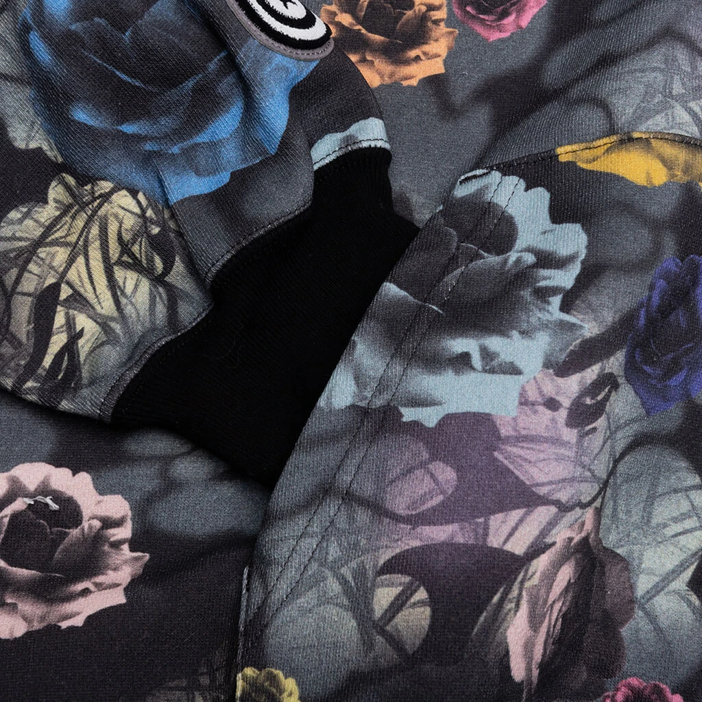 The Floral Camo Shark Relaxed Fit Full Zip Hoodie in Black blends bold design with everyday comfort. Made from cotton, it features an all-over floral camo print, embroidered patchwork, and printed graphics for a striking look. Functional details include a full-zip closure, front pockets, and ribbed trims, offering both style and practicality in a relaxed fit silhouette.