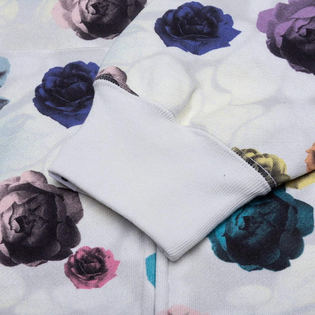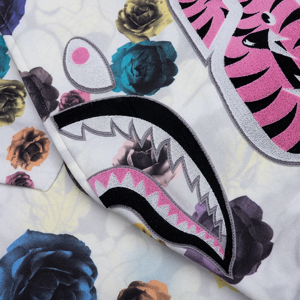 The Floral Camo Shark Relaxed Fit Full Zip Hoodie in Ivory blends bold design with everyday comfort. Made from cotton, it features an all-over floral camo print, embroidered patchwork, and printed graphics for a striking look. Functional details include a full-zip closure, front pockets, and ribbed trims, offering both style and practicality in a relaxed fit silhouette.