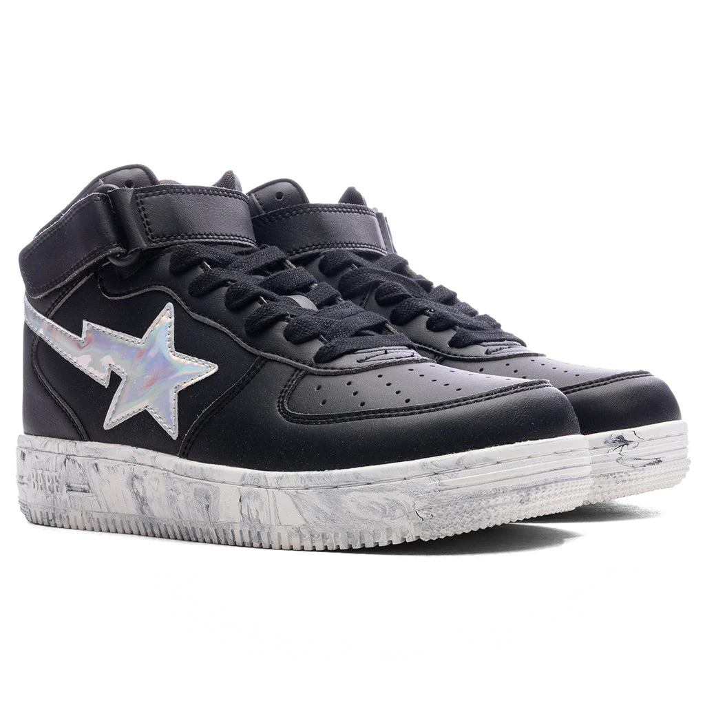 Updating the retro-inspired mid top with a sleek and minimalistic touch, the Marble Bape STA Mid M1 presents a sleek black design with marble designing on the midsole. Crafted from smooth leather, the upper showcases the iconic STA logo and a velcro strap for added support. Bape STA branding is featured on the woven tongue tag and back tab, and a second Ape Head emblem. The sneaker is anchored by a robust rubber cupsole, providing both durability and a polished appearance from top to bottom.