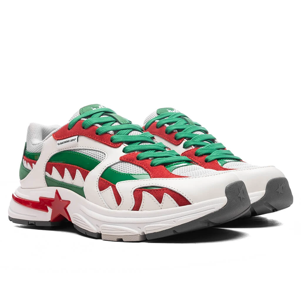 A bold evolution of BAPE’s signature sneaker design, the Shark STA blends premium materials with unmistakable street energy. This low-top silhouette arrives in a fresh colorway, constructed from a mix of materials like patent leather, suede, and mesh for a dynamic, layered look. Graphic appliqués at the side panel nod to the brand’s iconic motifs, while a logo patch at the padded tongue and a branded heel tab reinforce its heritage. The shoe is finished with a mesh lining, cushioned midsole with logo detailing, and a treaded rubber outsole.