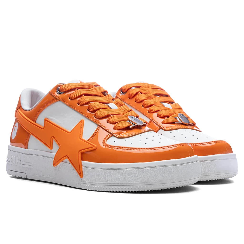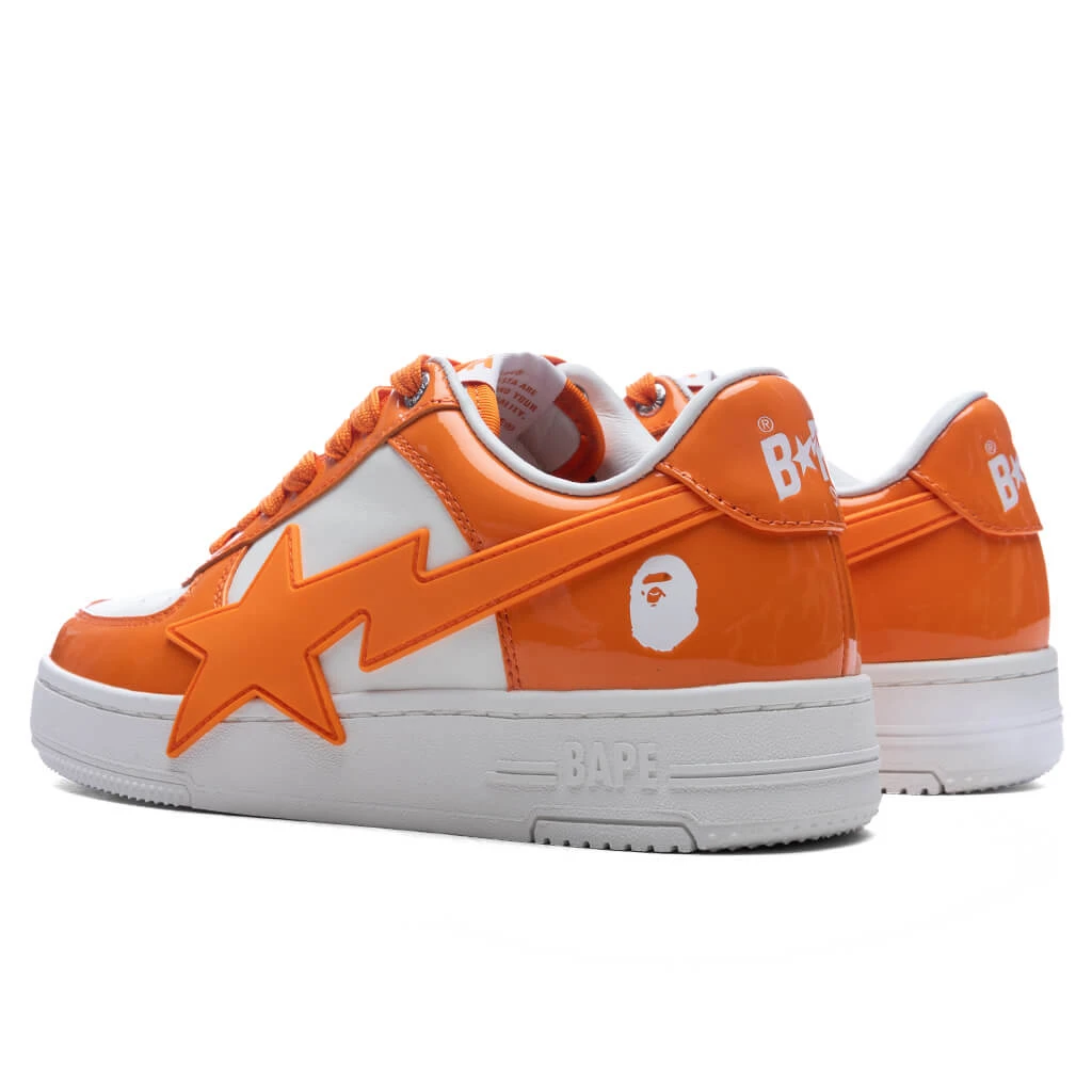 The Women’s Bape STA OS #3 in Orange reimagines a classic silhouette with bold details. Featuring a leather upper with patent leather overlays, the design showcases an exaggerated STA logo for a standout look. A perforated toe box adds breathability, while the branded dubraé and embroidered heel provide signature finishing touches.